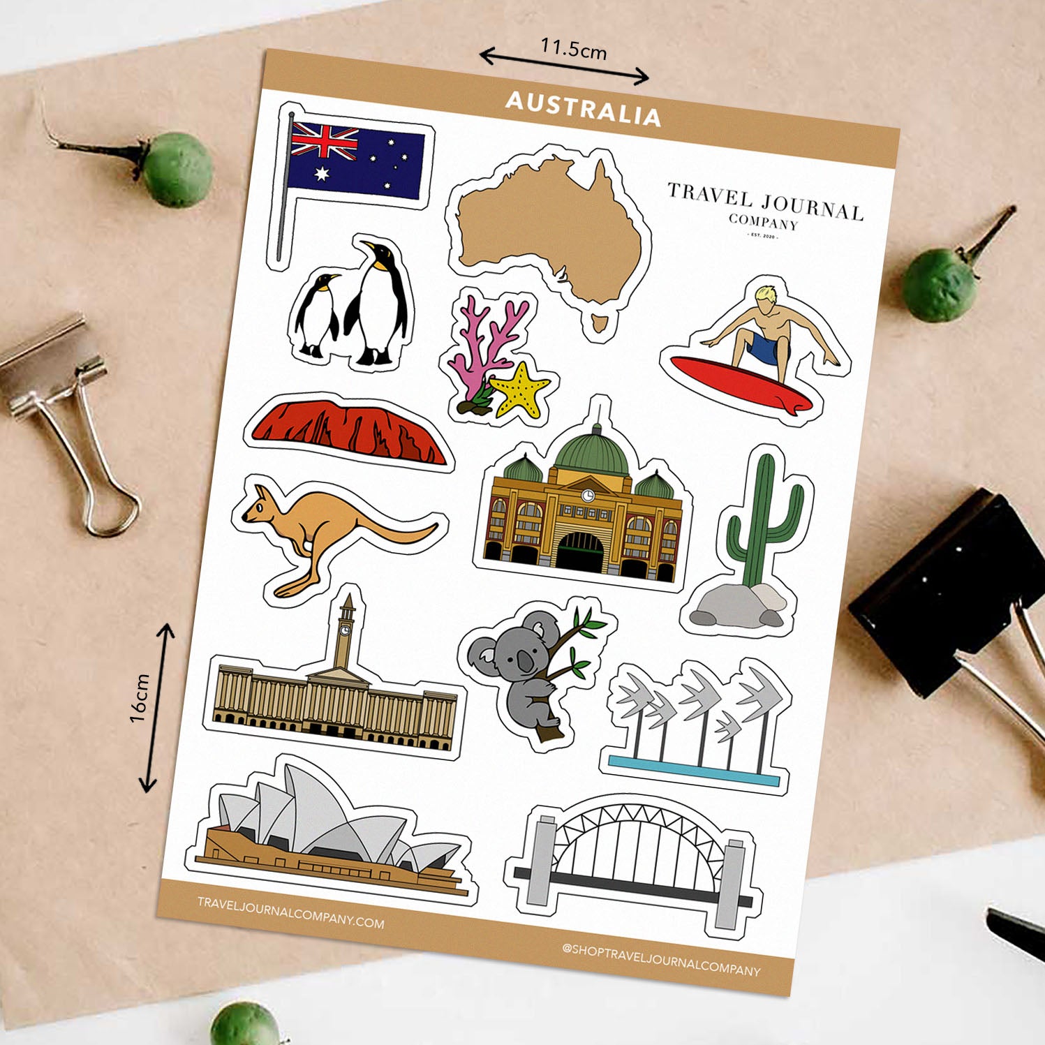 The sticker sheet is 16x11.5 cm (6 1/2 x 4 1/2 inches). It's printed on waterproof, matt vinyl paper with permanent adhesive. The stickers peel off individually.