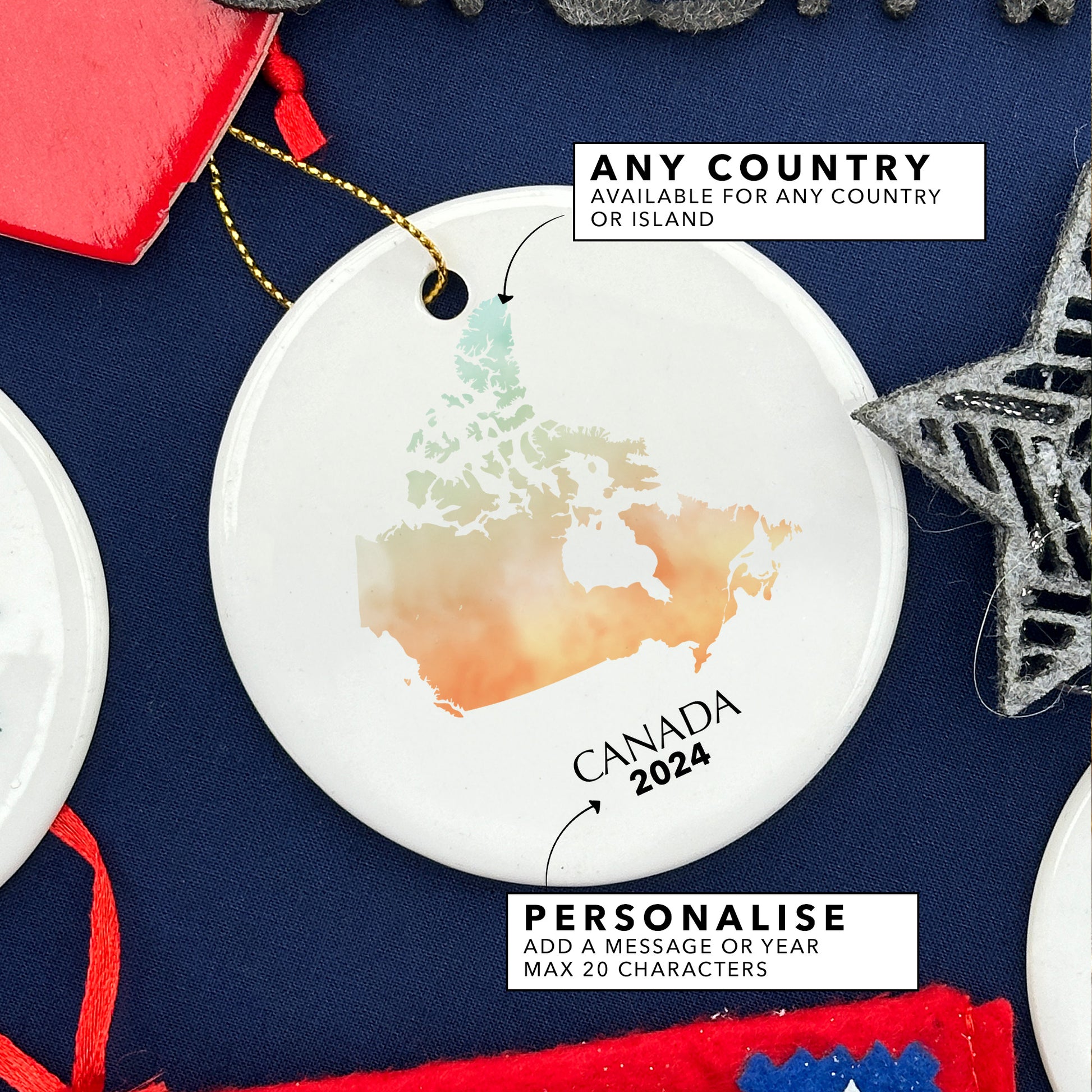 The centerpiece of this ornament is a beautifully rendered watercolour map of your chosen country. To make this ornament truly unique, personalised text is gracefully added beneath the map. Whether it's a family name, a special date, a meaningful quote, or a heartfelt message, the customisation is rendered in elegant, scripted lettering that complements the artistic design. This personal touch transforms the ornament into a cherished keepsake that celebrates memories of home, travel adventures, heritage, or meaningful connections to a particular place.