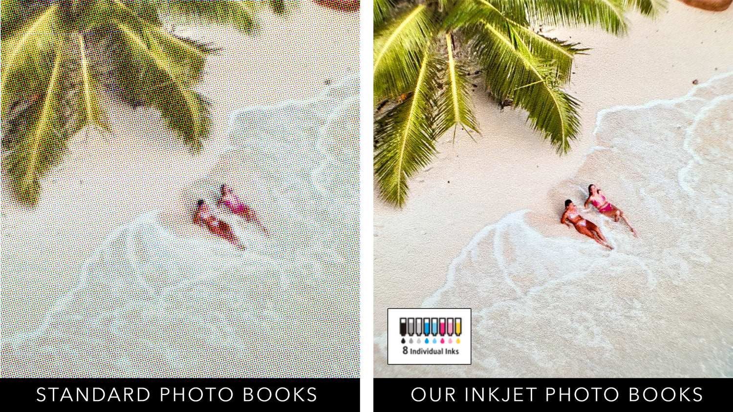 Experience the best print quality out there. The widest colour range and razor sharp images. 8-colour printing that beats all press printed photo books. For a more cost efficient option, try our 6-colour inkjet print.