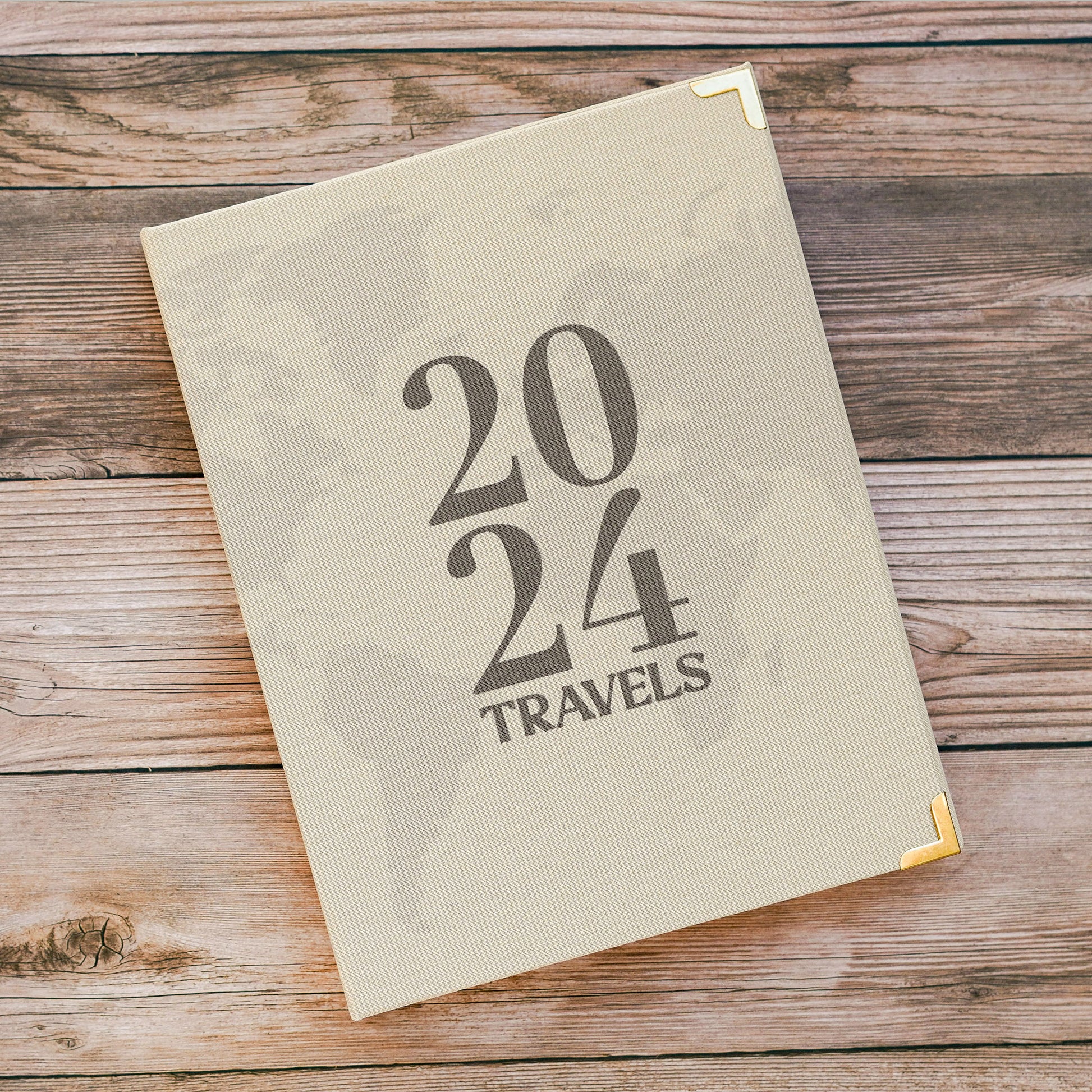 Personalised A5 linen binder for photo book inserts. This design feature large numbers showing your chosen year on a faint world map printed on luxury cream linen. You can add additional optional personalisation such as a name or quote to the bottom of the cover. Spine text includes the word 'Travels' and the year.