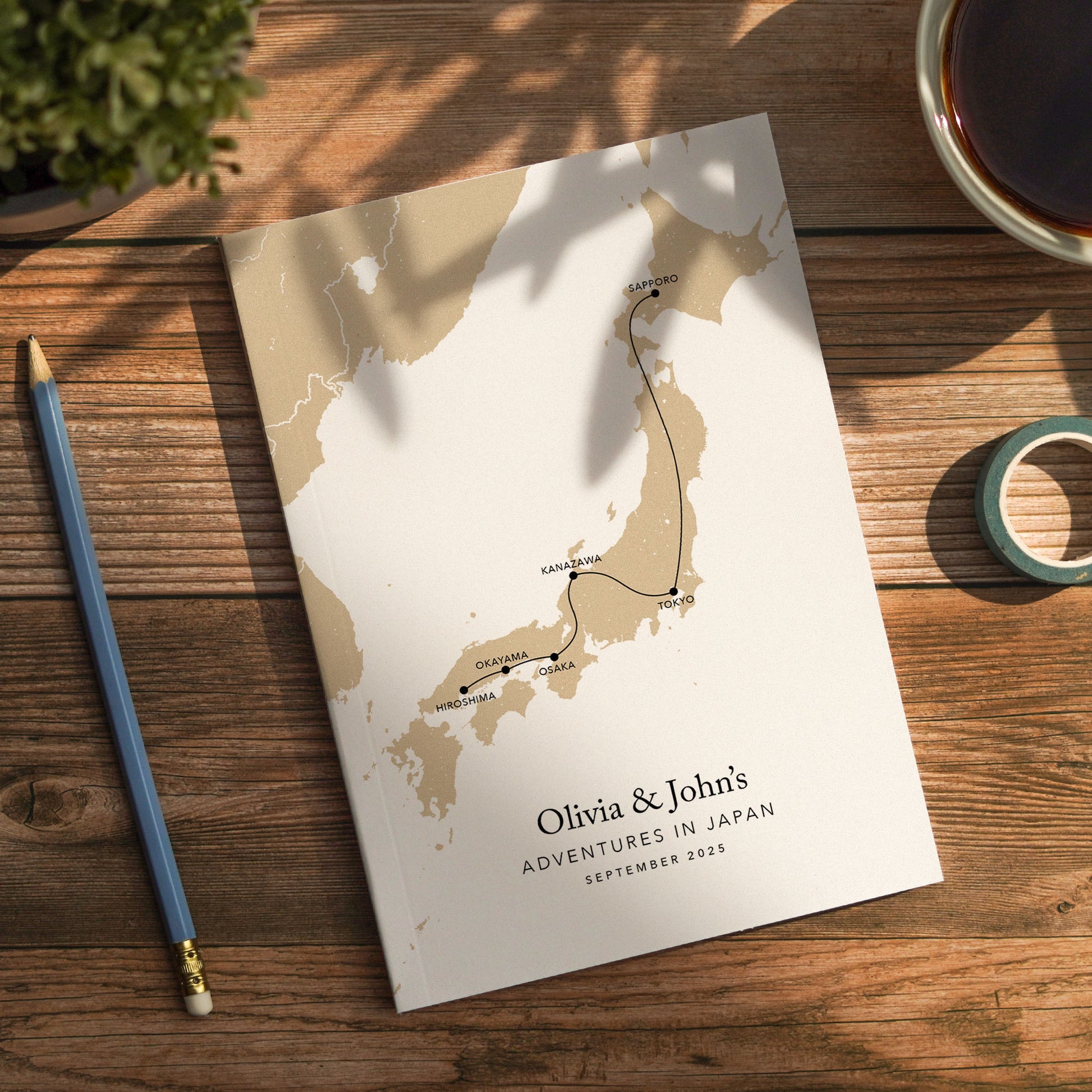 Travel Journal/Notebook with custom map and personalised titles. Add your travel destinations to the cover of your notebook and personalise the main titles. The land section of the map are coloured while the water areas are white. Perfect for making notes, writing a diary or for drawing. Personalise it for a special gift or before embarking on your next journey!
