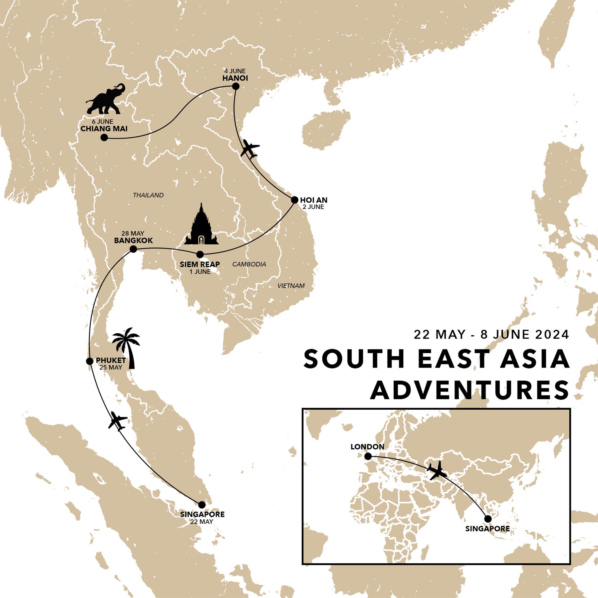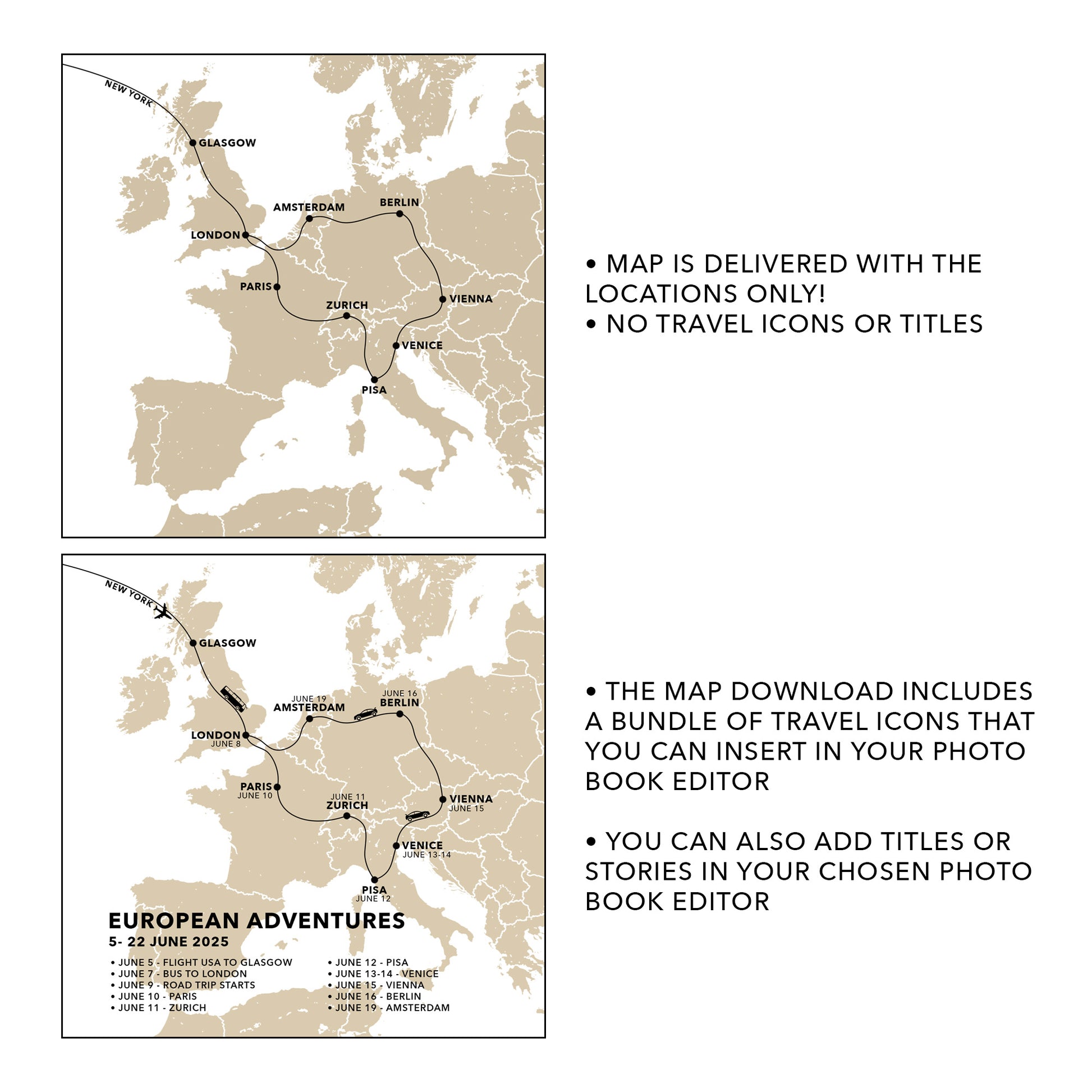 The map will include your listed locations only. It does not include any other labels or travel icons. You will receive a bundle pack of transport icons and flags with your map that you can insert into your photo book editor to embellish your map.