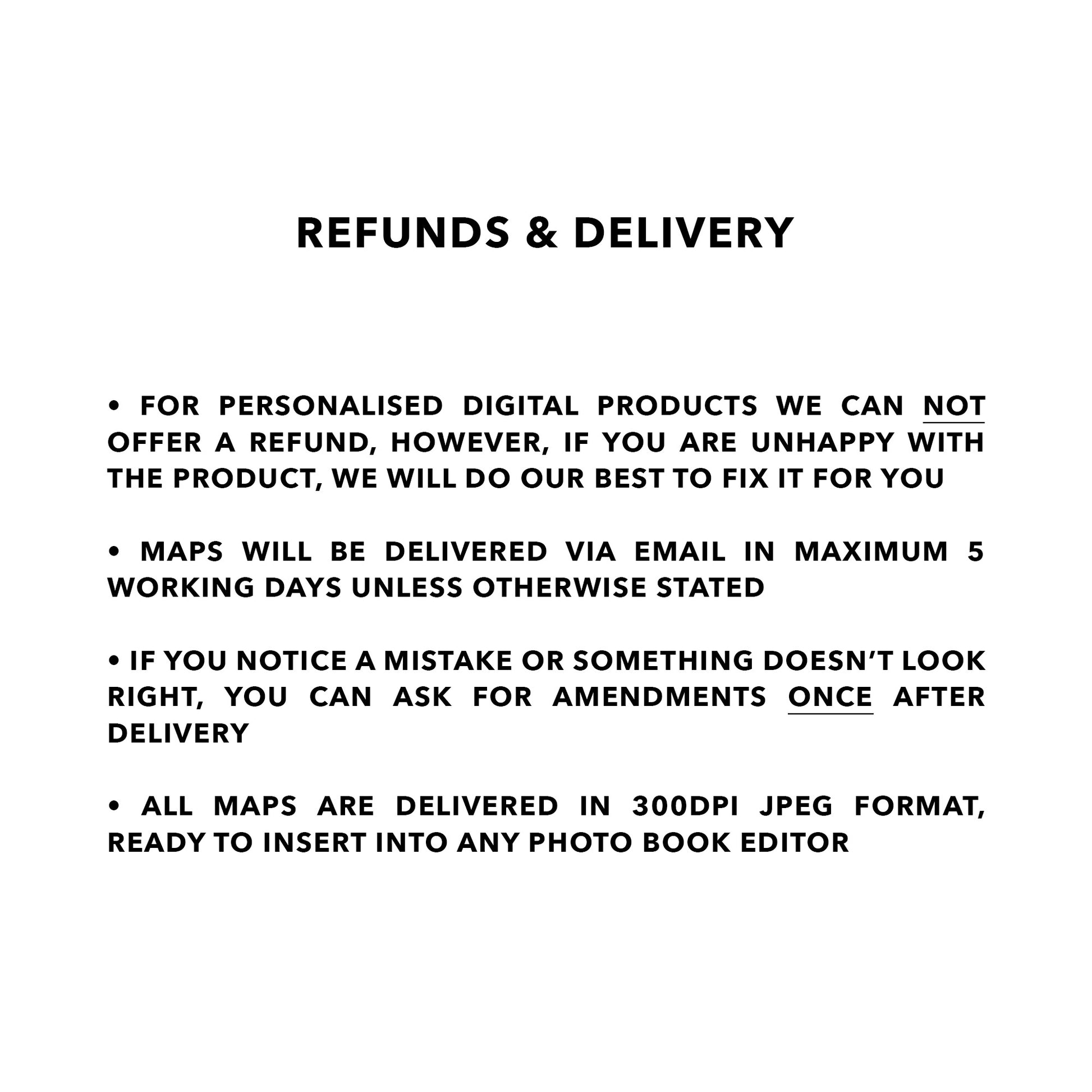 Photo book maps are personalized products that are created for you specifically. Although we can't refund already processed orders, we will do our best to fix any issues you might have.