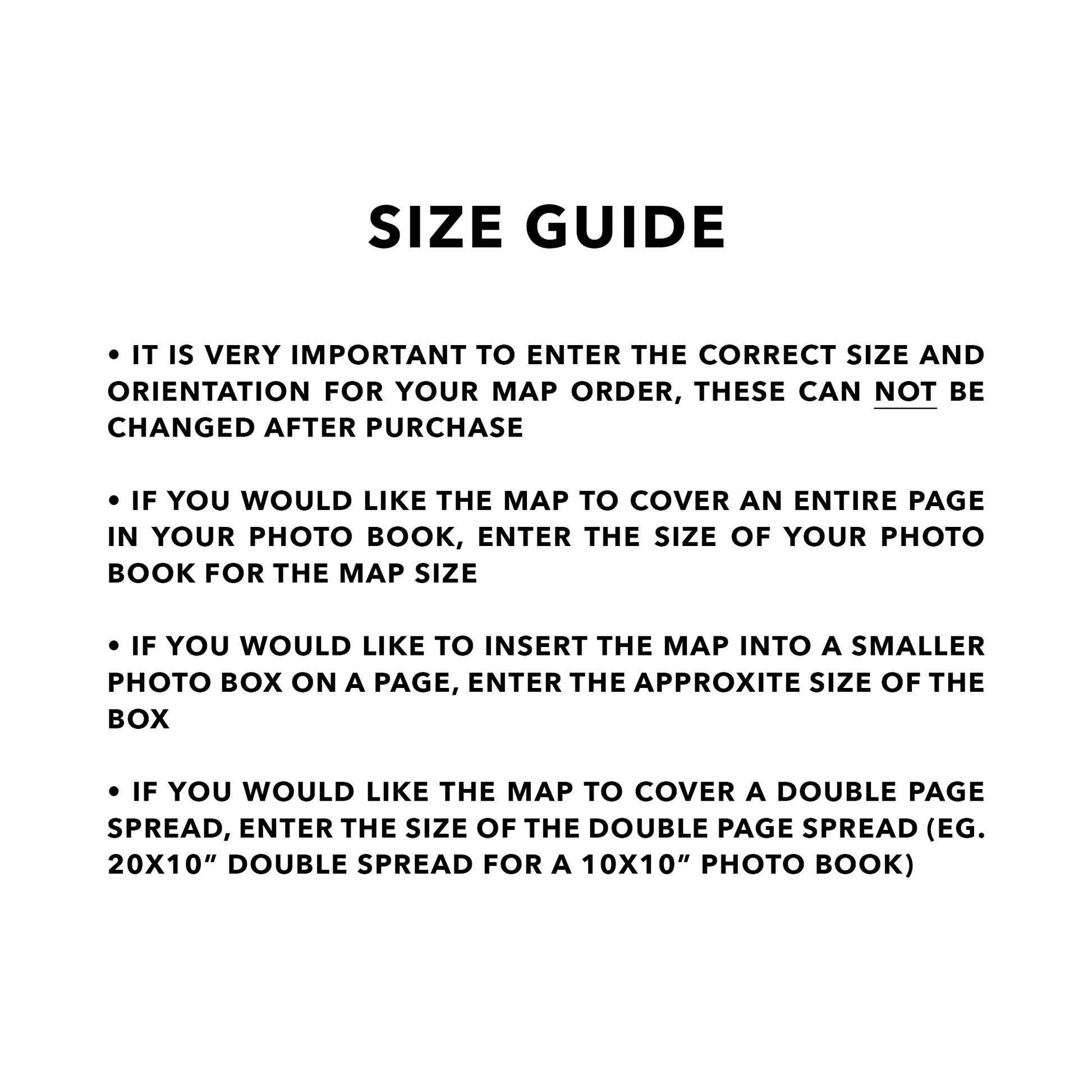 We can create a map for any photo book size up to 16x12 inches or A3. Simply enter the size of your chosen photo book when you order. Please note, this information can't be changed after purchase.