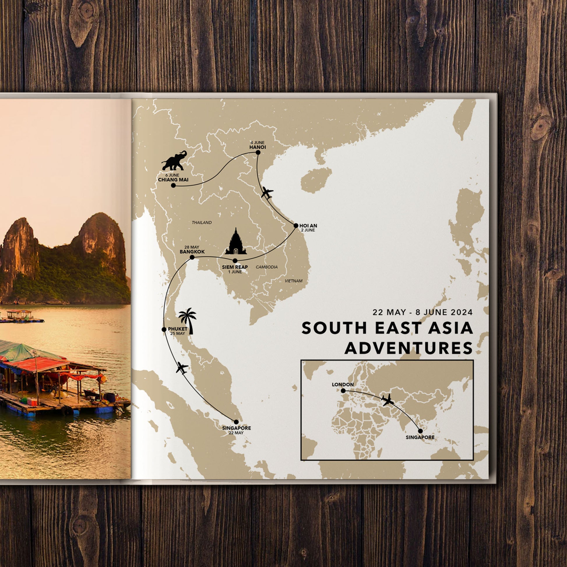 Create amazing looking maps for your travel photo books in less than a minute! Fill in the order form and your custom designed map will be delivered in less than 5 days ready to insert into your photo book.