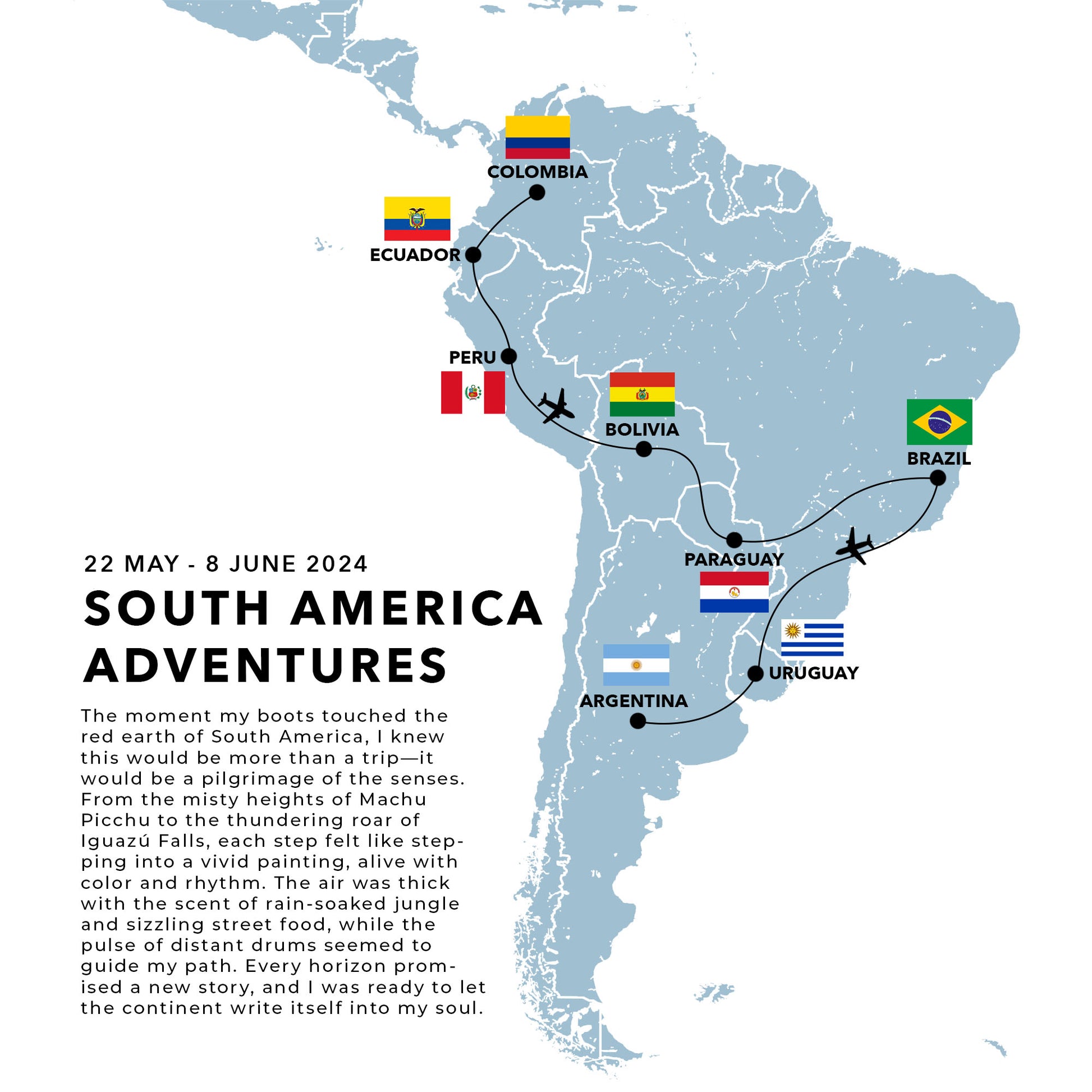The maps have a minimalist design that will fit any project. Pastel shades without clutter, highlighting only your visited destinations. Add travel icons, flags, titles and stories (these are added in your photo book editor of choice).