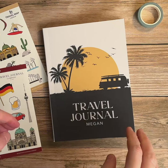 Personalised Travel Journal with printed inner pages. This beautiful travel journal is perfect for documenting multiple journeys from around the world. The printed templates will guide you and make journaling more fun. Personalize the cover with a name or names. Perfect gift for those who love travelling! Check out our other listings for different cover styles, custom map journals, illustrated journals or fun travel stickers