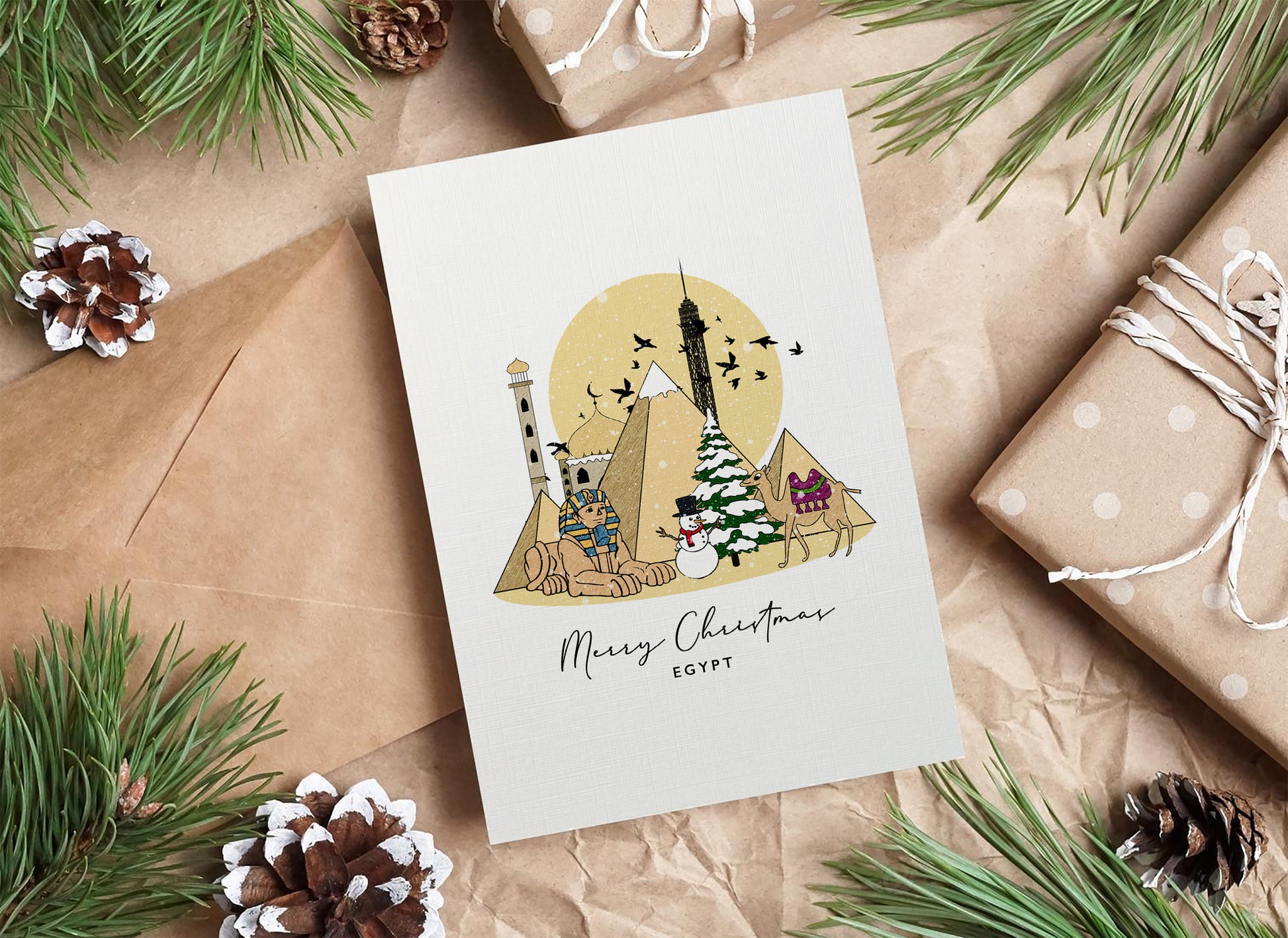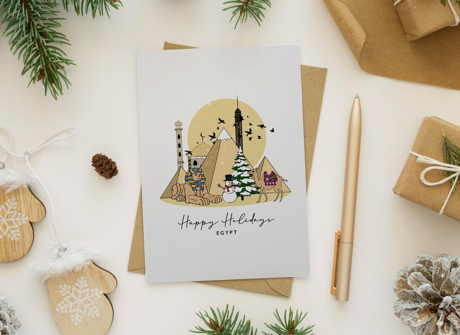 Illustrated Personalised Christmas Card printed on a beautiful linen texture card stock. Perfect for travellers or as a souvenir. You can select the text on the front of the card, "Merry Christmas" or "Happy Holidays" so it's perfect even if you don't celebrate Christmas and you can add a personal message inside the card.