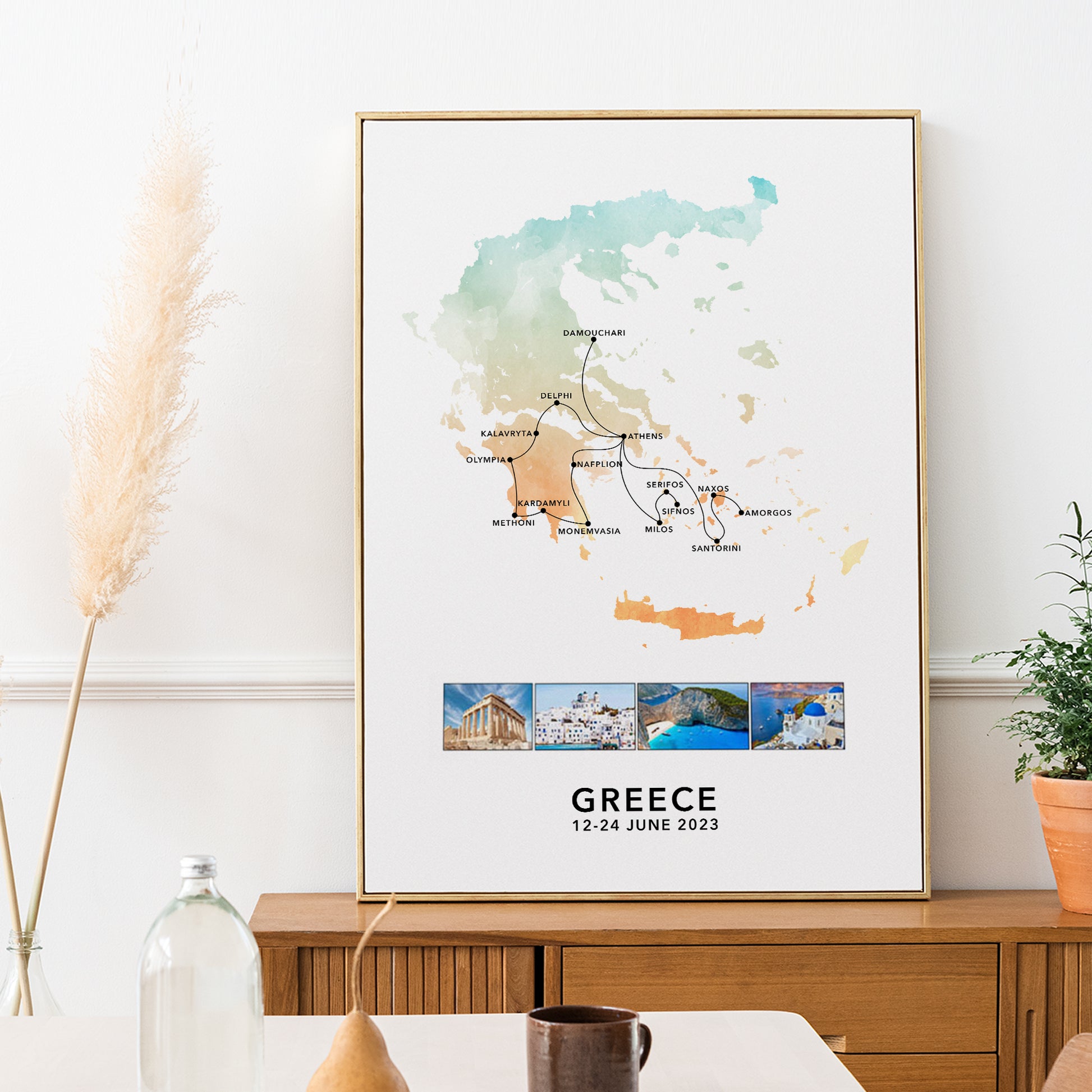 Personalised travel map print with custom locations, travel path and photos in many colours and shades. Make it extra personal by displaying optional travel dates, a photo collage and all the amazing places you visited. Your visited locations will be connected by a path in the order you list them or pinpointed without a path (please indicate). The map can show an entire country or could be zoomed in to showcase your locations in the most detail.