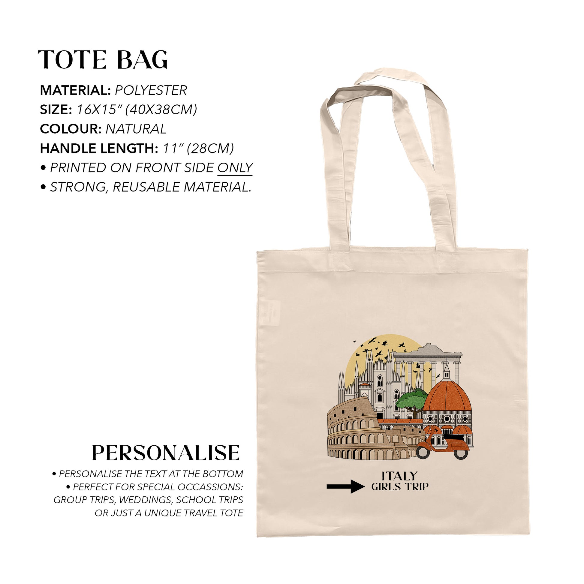 The bag features a beautifully illustrated design showcasing iconic landmarks. Each illustration is vibrant and detailed, capturing the essence and charm of the city/country in a unique and artistic way. To make it truly yours, personalisation is available just below the city name. You can add your name, a memorable date, or a short phrase that holds special meaning to you. This makes it perfect for special events, groups trips, girls trips, school trips and other occasions.
