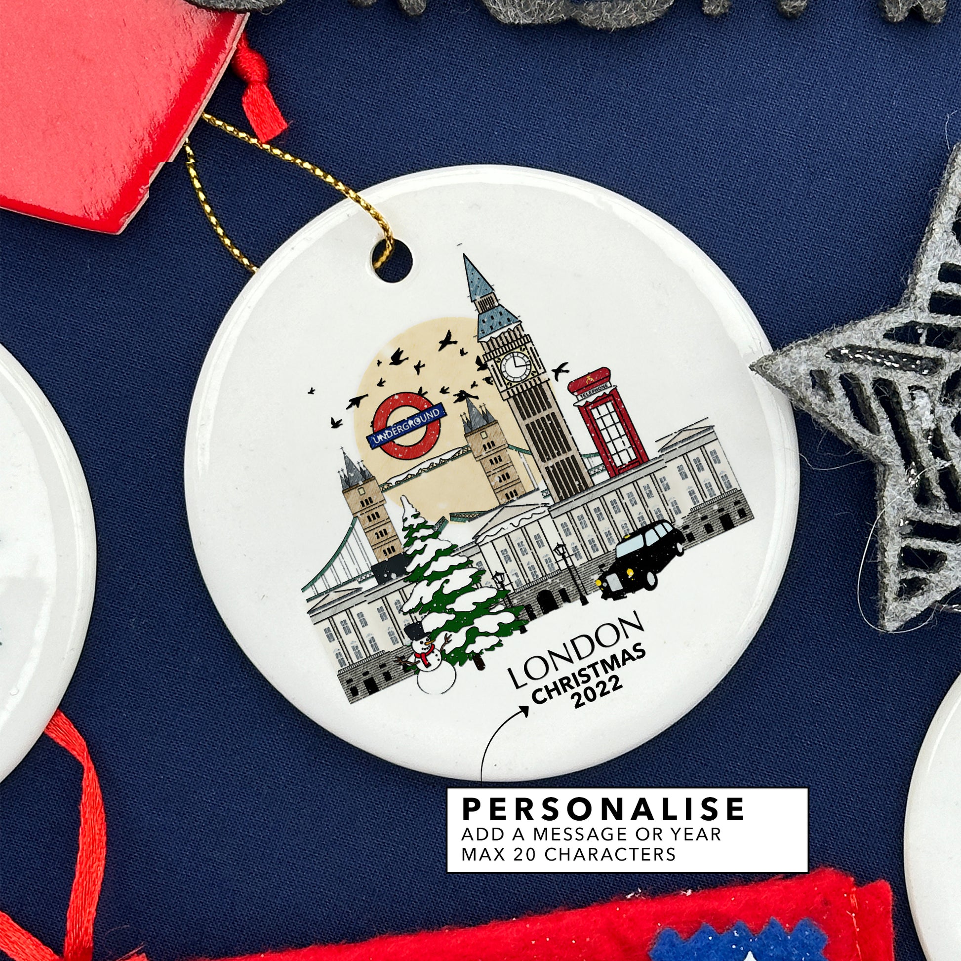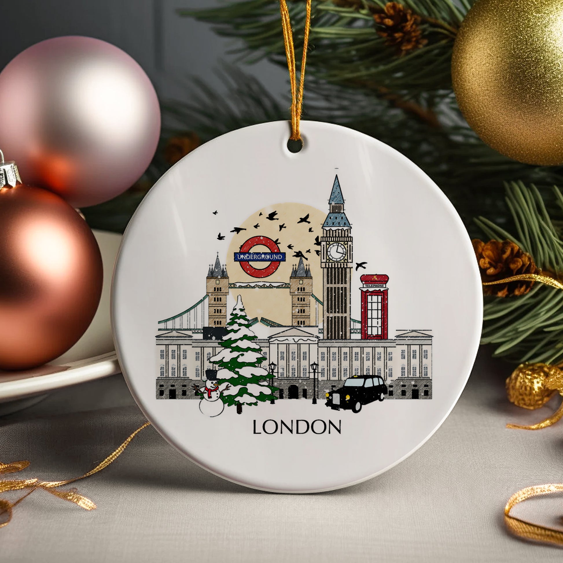 This ceramic Christmas tree ornament is a charming keepsake, beautifully designed to capture the spirit of the season and the essence of a beloved city. The ornament is crafted from high-quality ceramic, with a glossy finish that enhances its vibrant colors. It is shaped in a classic round form, perfect for hanging on any Christmas tree.