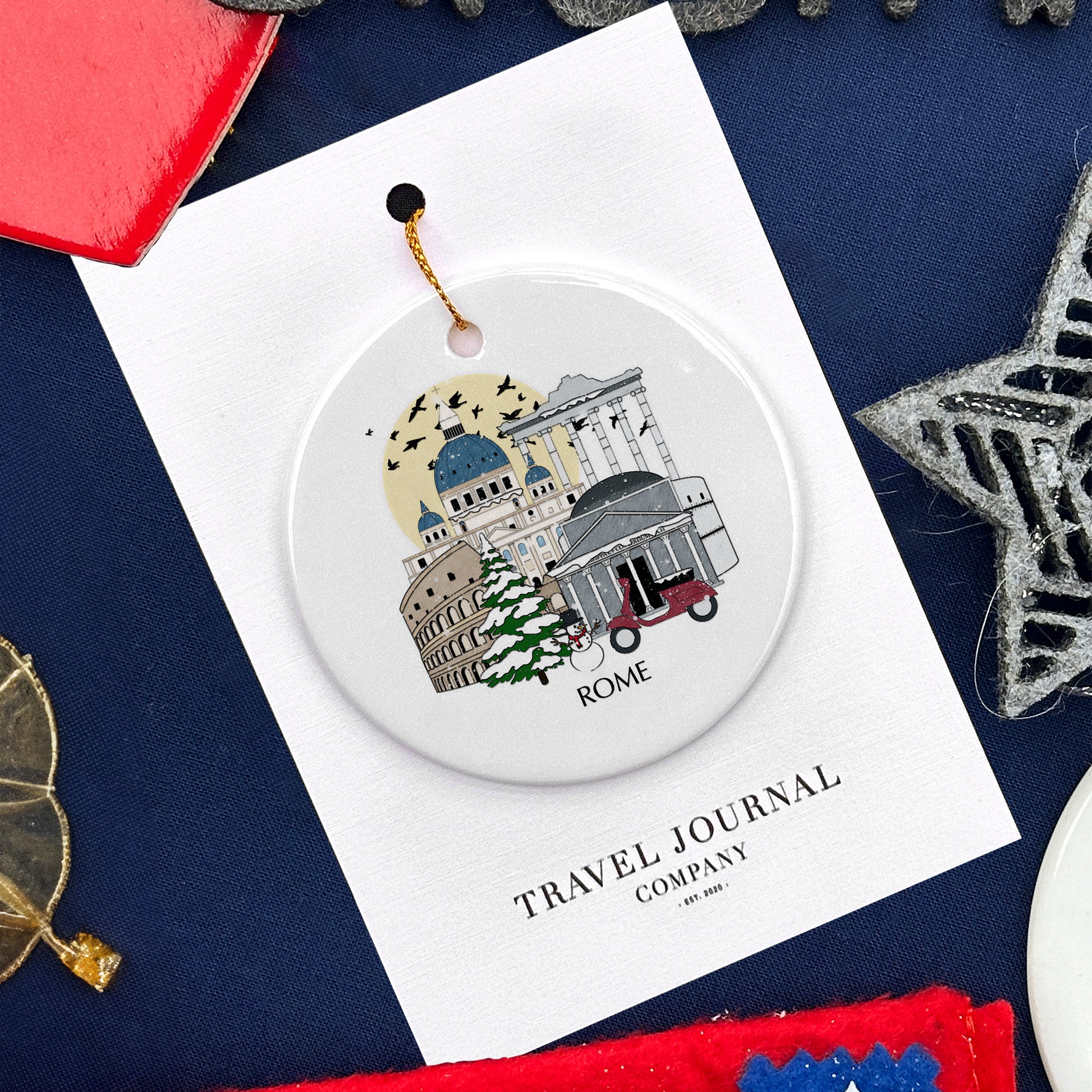 This ceramic Christmas tree ornament is a charming keepsake, beautifully designed to capture the spirit of the season and the essence of a beloved city. The ornament is crafted from high-quality ceramic, with a glossy finish that enhances its vibrant colors. It is shaped in a classic round form, perfect for hanging on any Christmas tree.