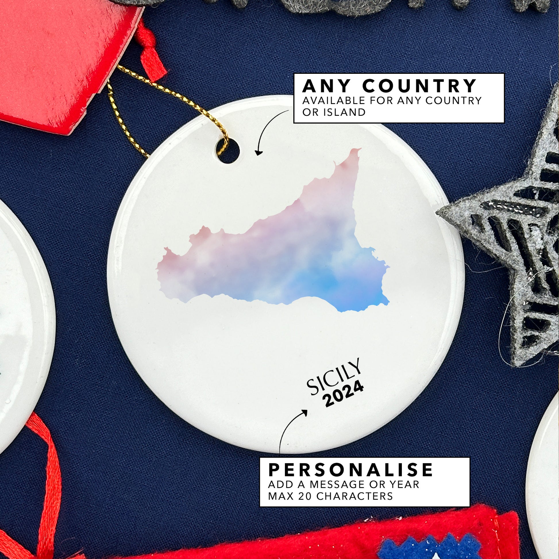 The centerpiece of this ornament is a beautifully rendered watercolour map of your chosen country. To make this ornament truly unique, personalised text is gracefully added beneath the map. Whether it's a family name, a special date, a meaningful quote, or a heartfelt message, the customisation is rendered in elegant, scripted lettering that complements the artistic design. This personal touch transforms the ornament into a cherished keepsake that celebrates memories of home, travel adventures, heritage, or meaningful connections to a particular place.