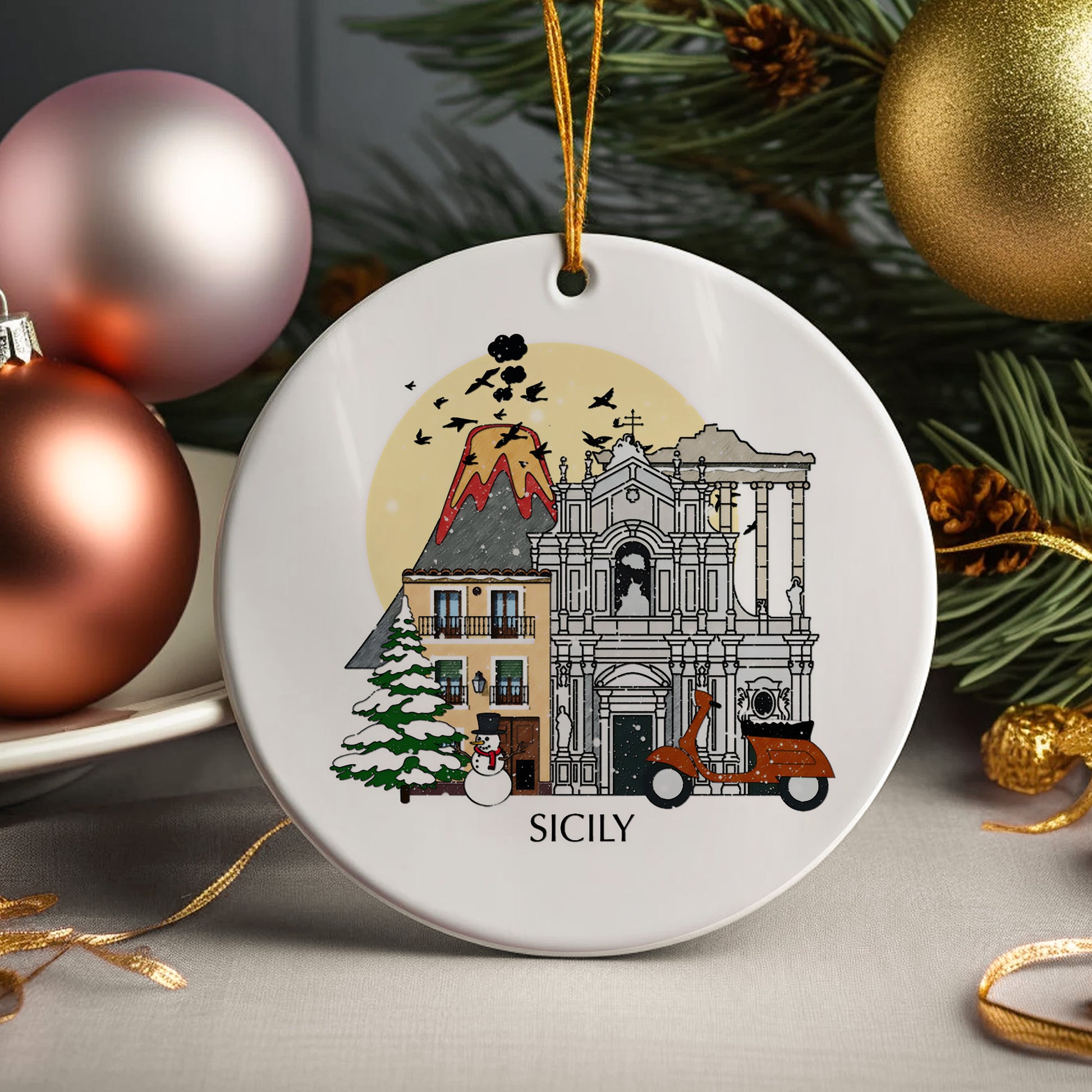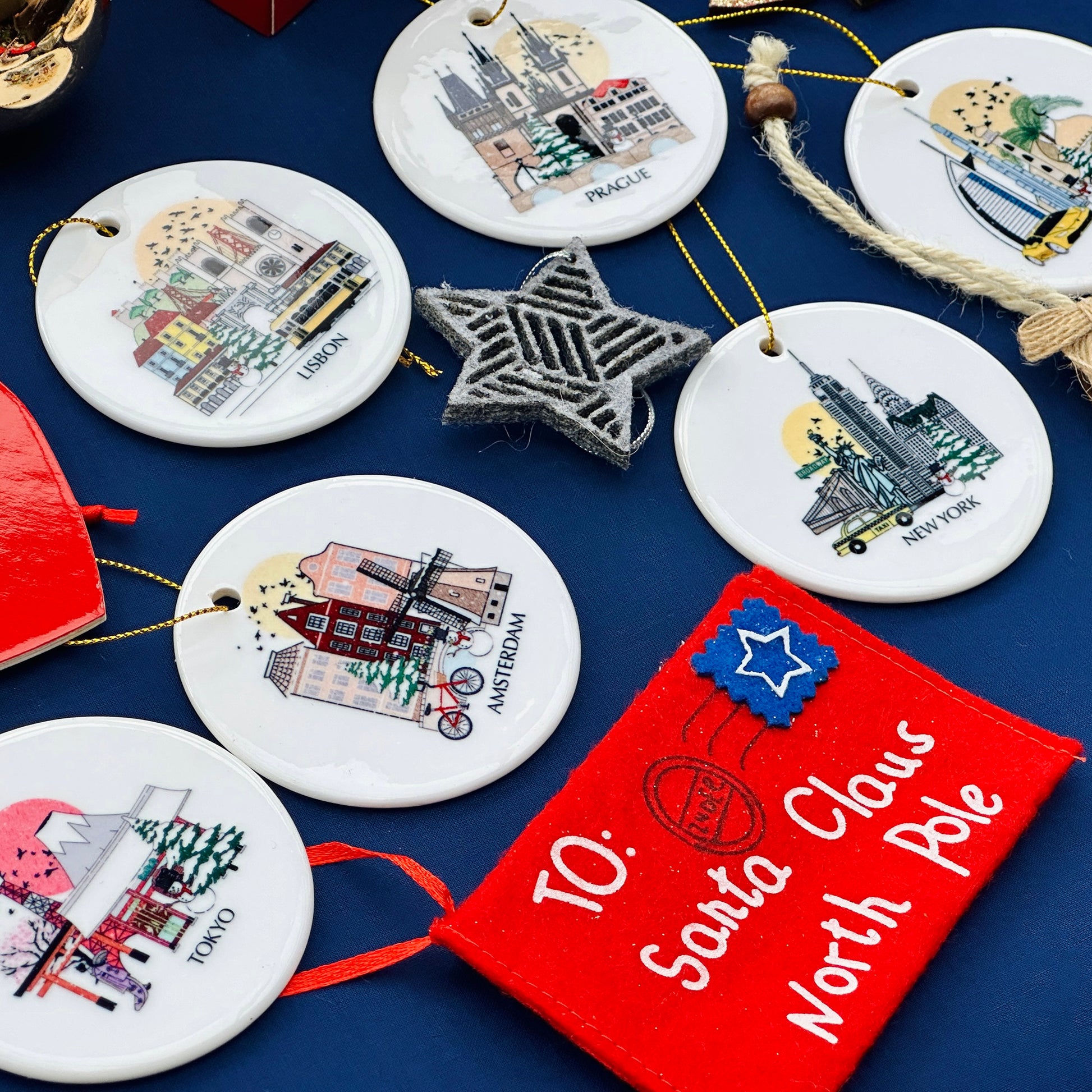 This ceramic ornament is not just a decoration; it’s a cherished reminder of special memories tied to the city, perfect for commemorating a trip, celebrating a hometown, or gifting to someone who holds a particular place close to their heart. The ornament comes with a gold ribbon for easy hanging, making it a delightful addition to any Christmas tree.
