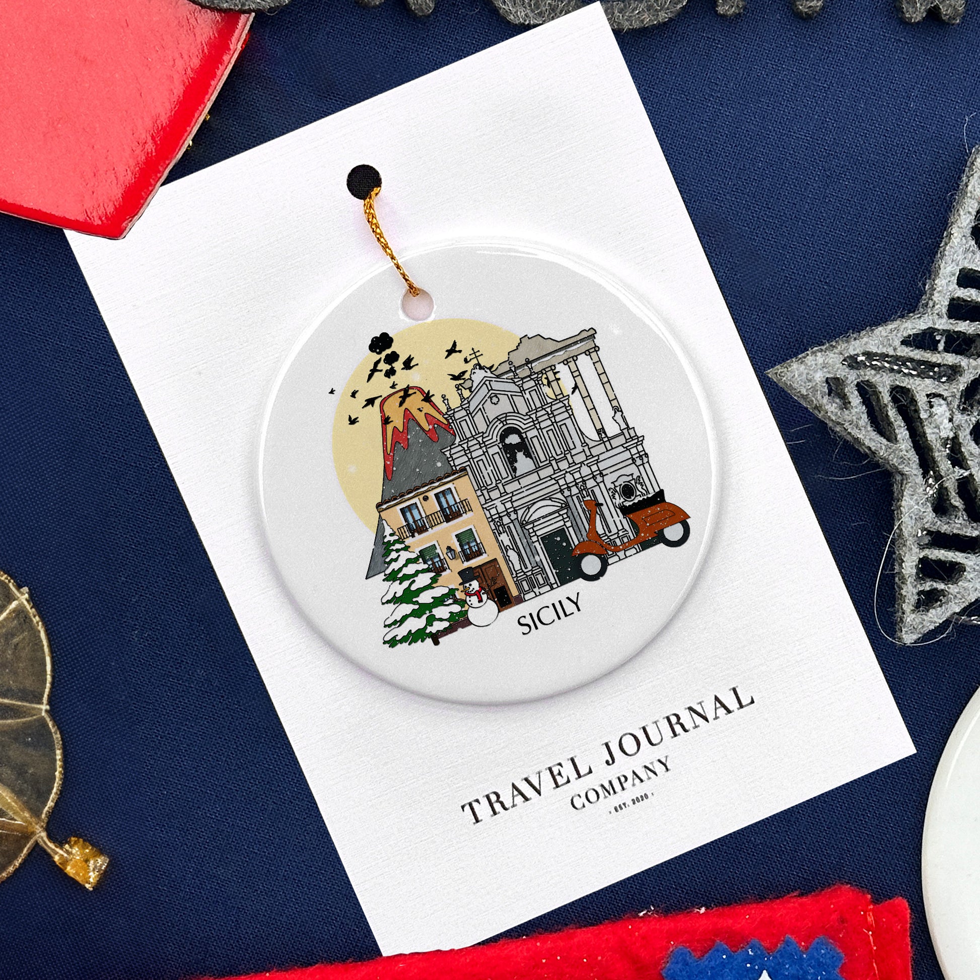 This ceramic Christmas tree ornament is a charming keepsake, beautifully designed to capture the spirit of the season and the essence of a beloved city. The ornament is crafted from high-quality ceramic, with a glossy finish that enhances its vibrant colors. It is shaped in a classic round form, perfect for hanging on any Christmas tree.
