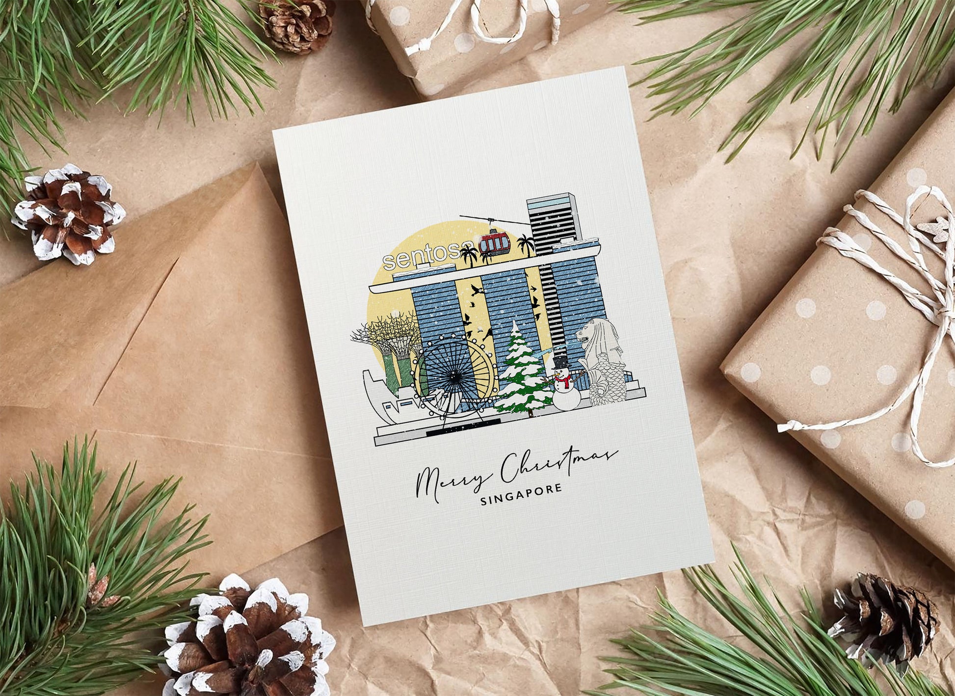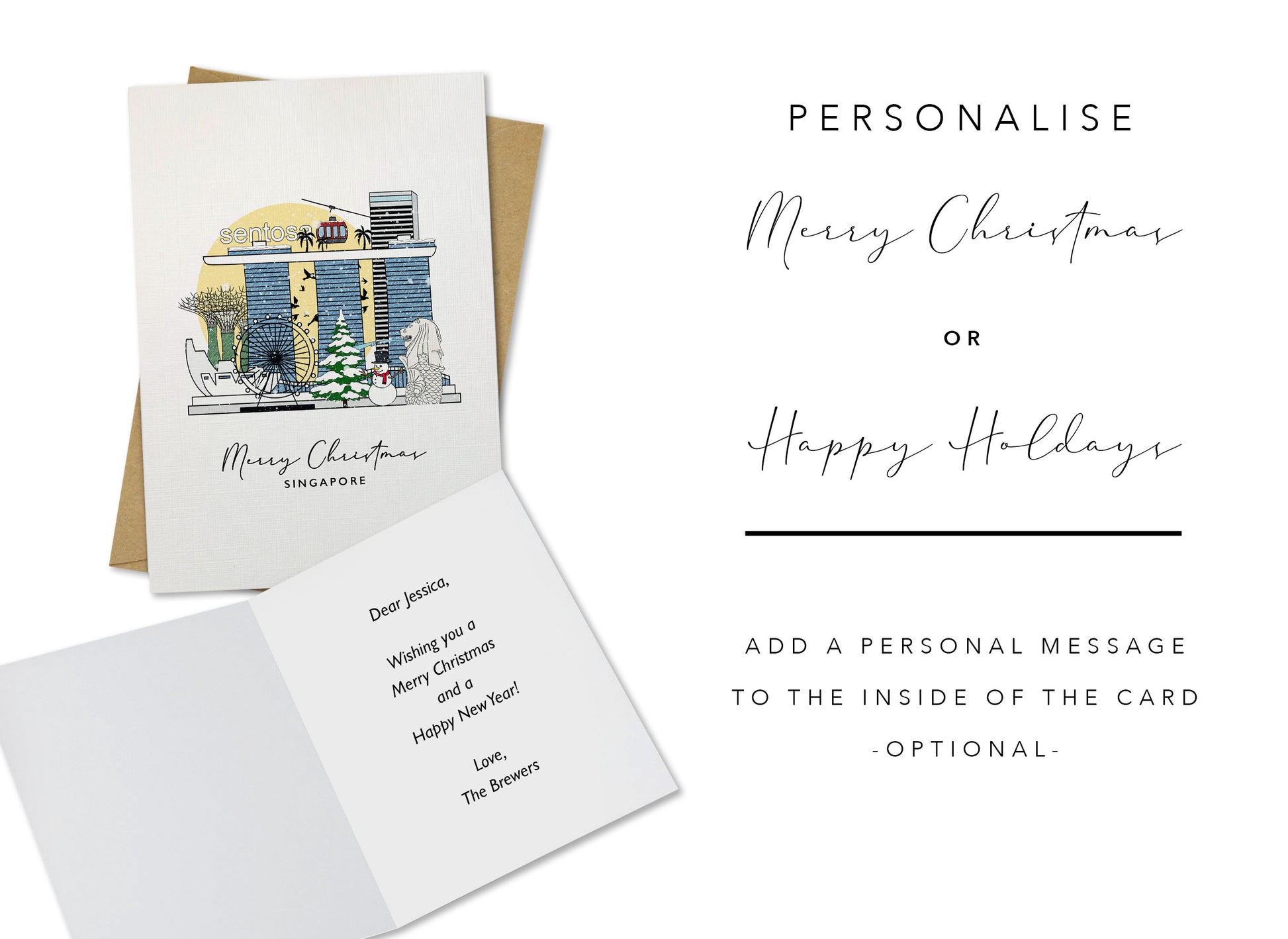 Illustrated Personalised Christmas Card printed on a beautiful linen texture card stock. Perfect for travellers or as a souvenir. You can select the text on the front of the card, "Merry Christmas" or "Happy Holidays" so it's perfect even if you don't celebrate Christmas and you can add a personal message inside the card.