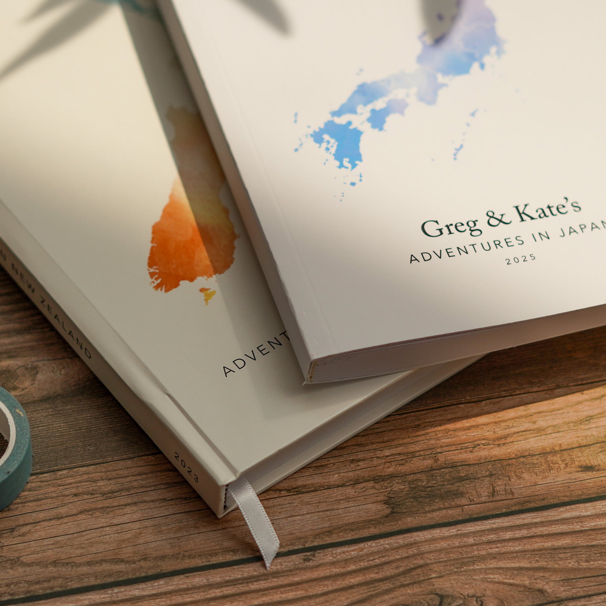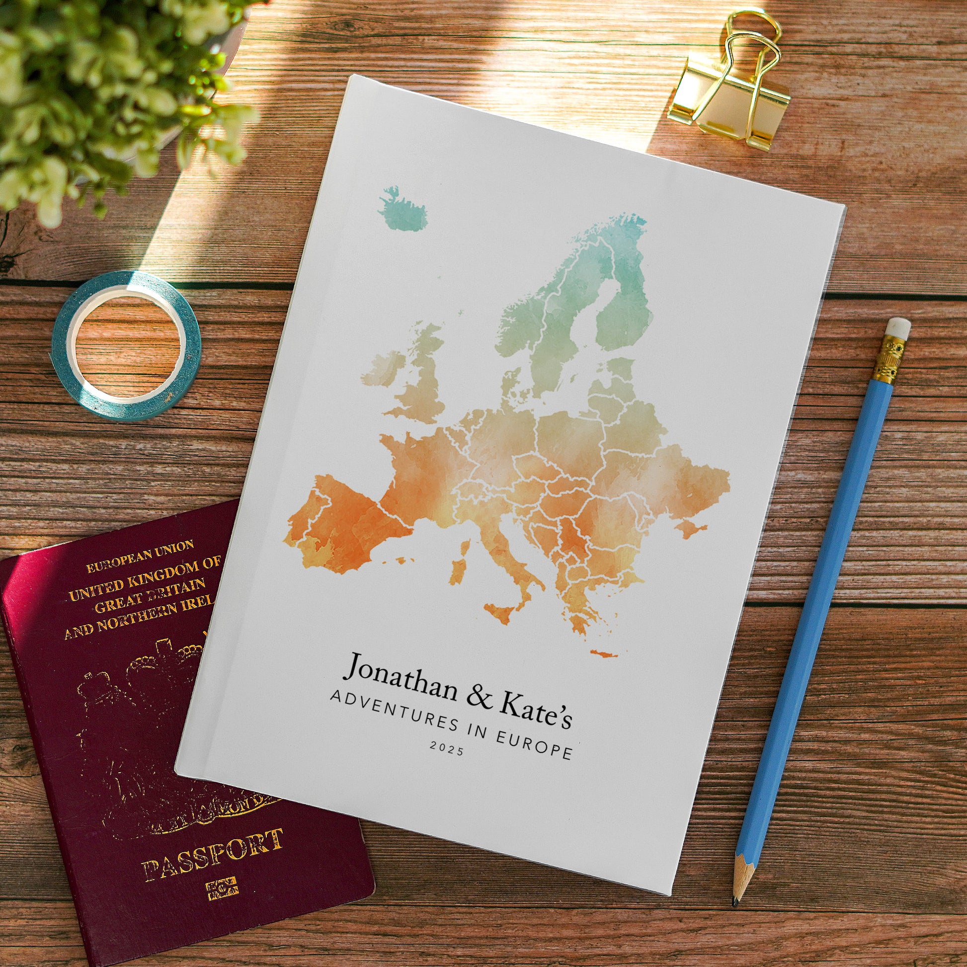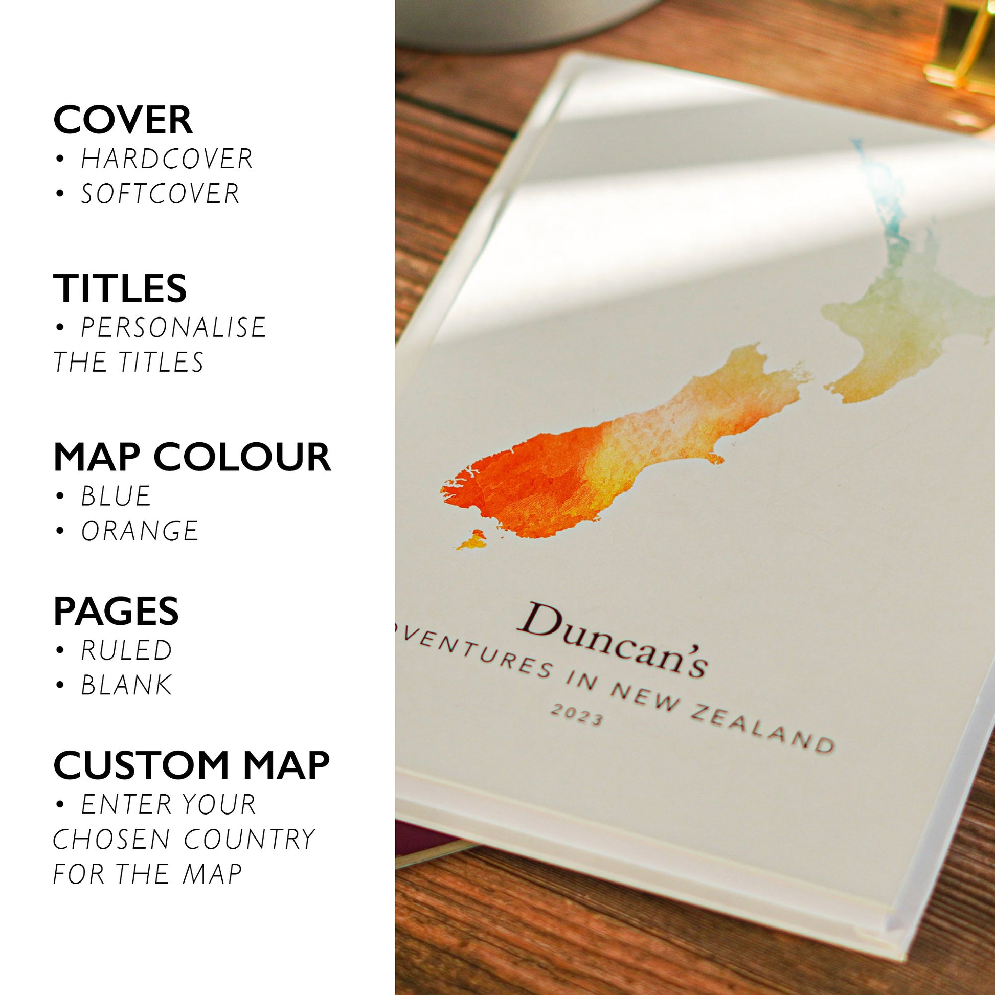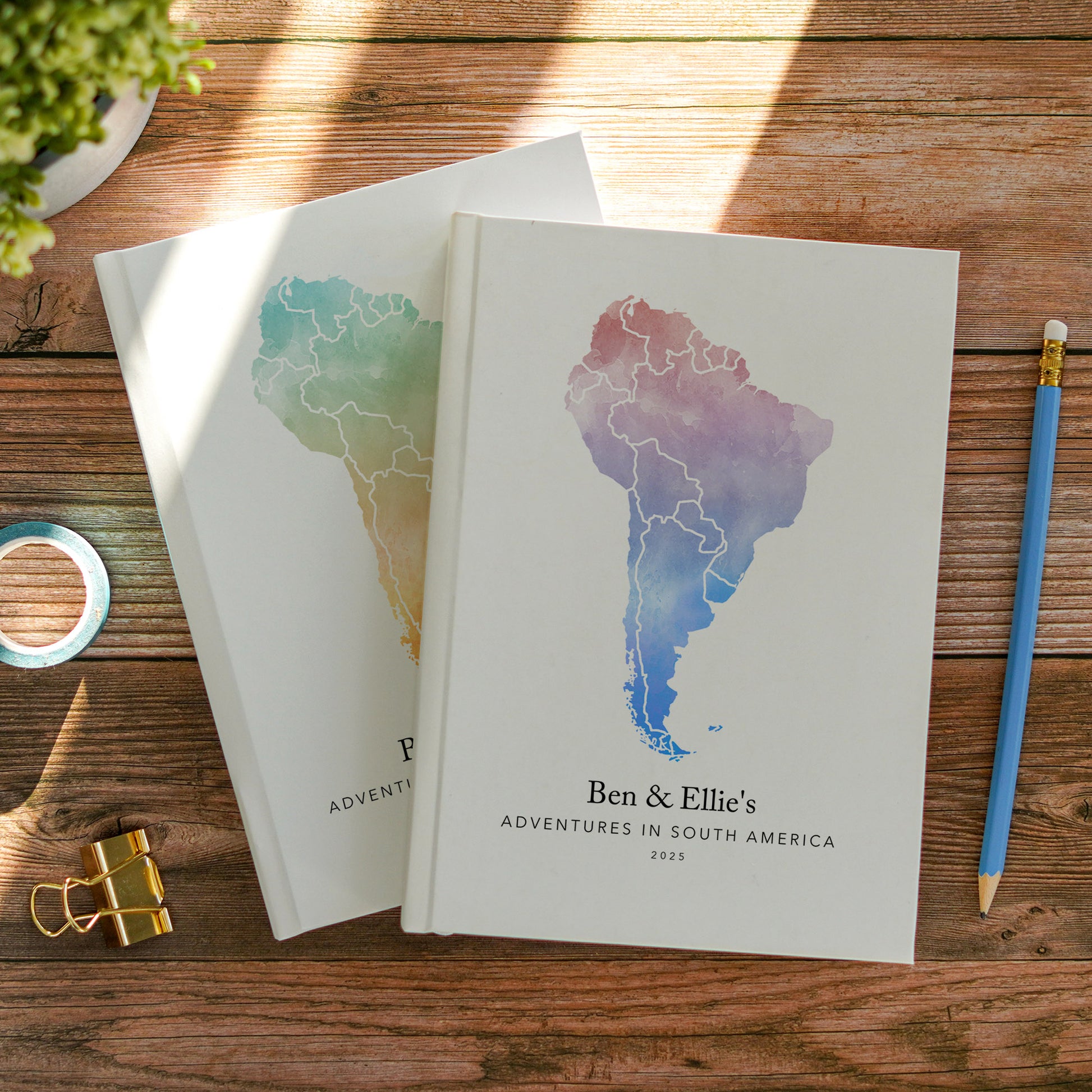 Stylish watercolour travel journal with personalised titles. Perfect for making notes, writing a diary or for drawing. Personalise it for a special gift or before embarking on your next journey!