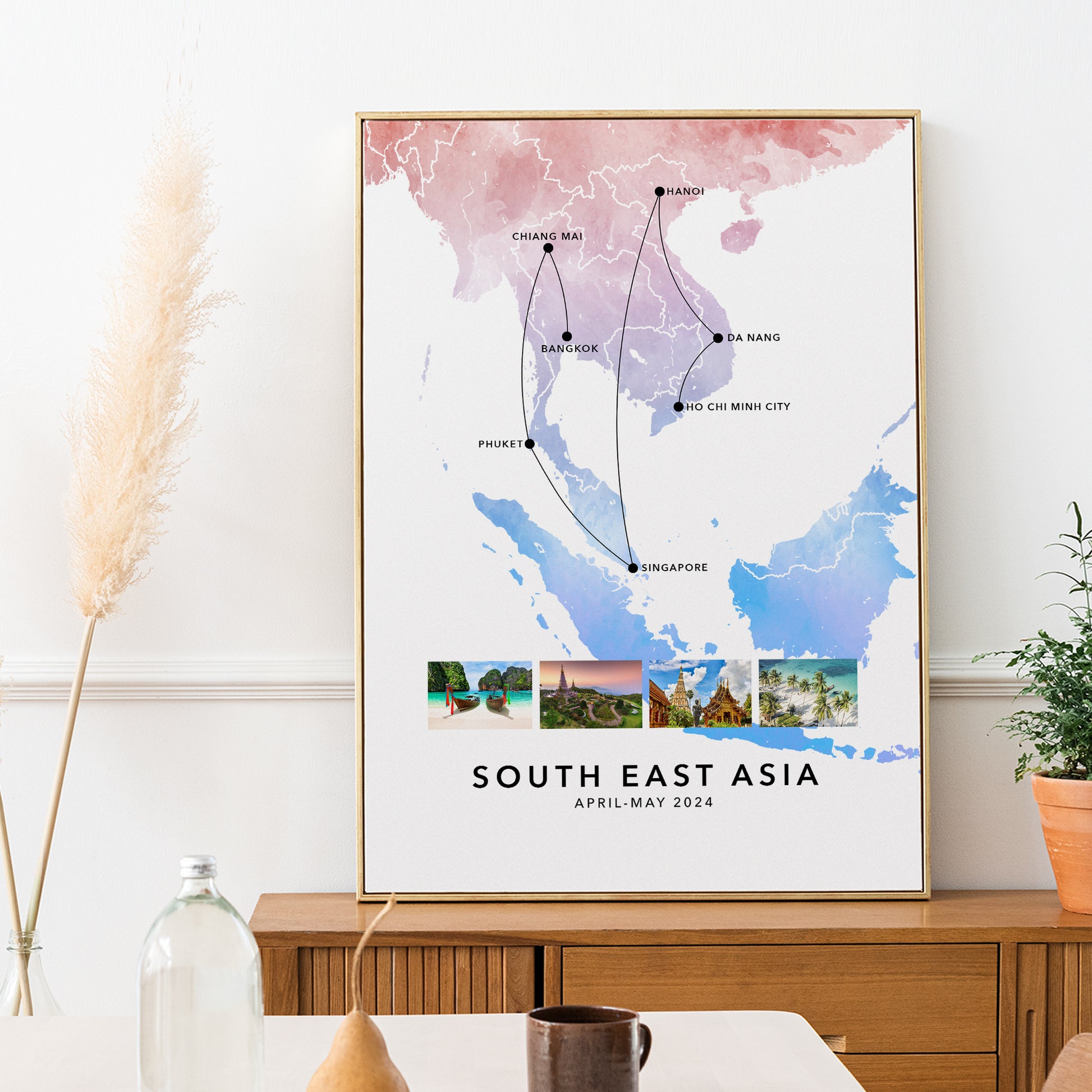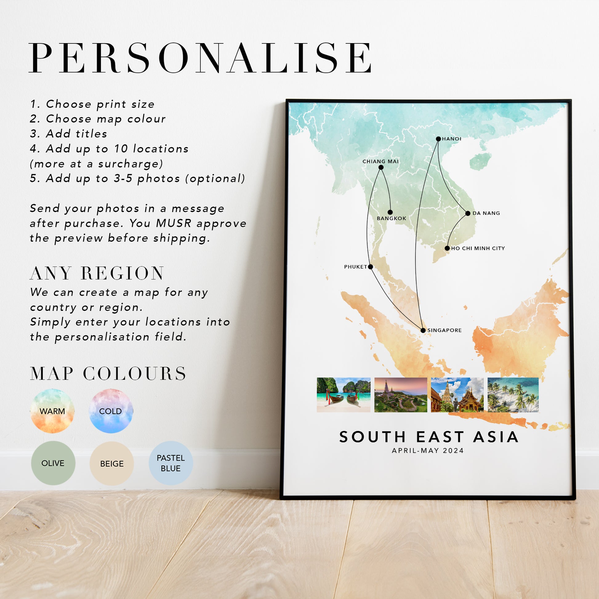 Personalised travel map print with custom locations, travel path and photos in many colours and shades. Make it extra personal by displaying optional travel dates, a photo collage and all the amazing places you visited. Your visited locations will be connected by a path in the order you list them or pinpointed without a path (please indicate). The map can show an entire country or could be zoomed in to showcase your locations in the most detail.
