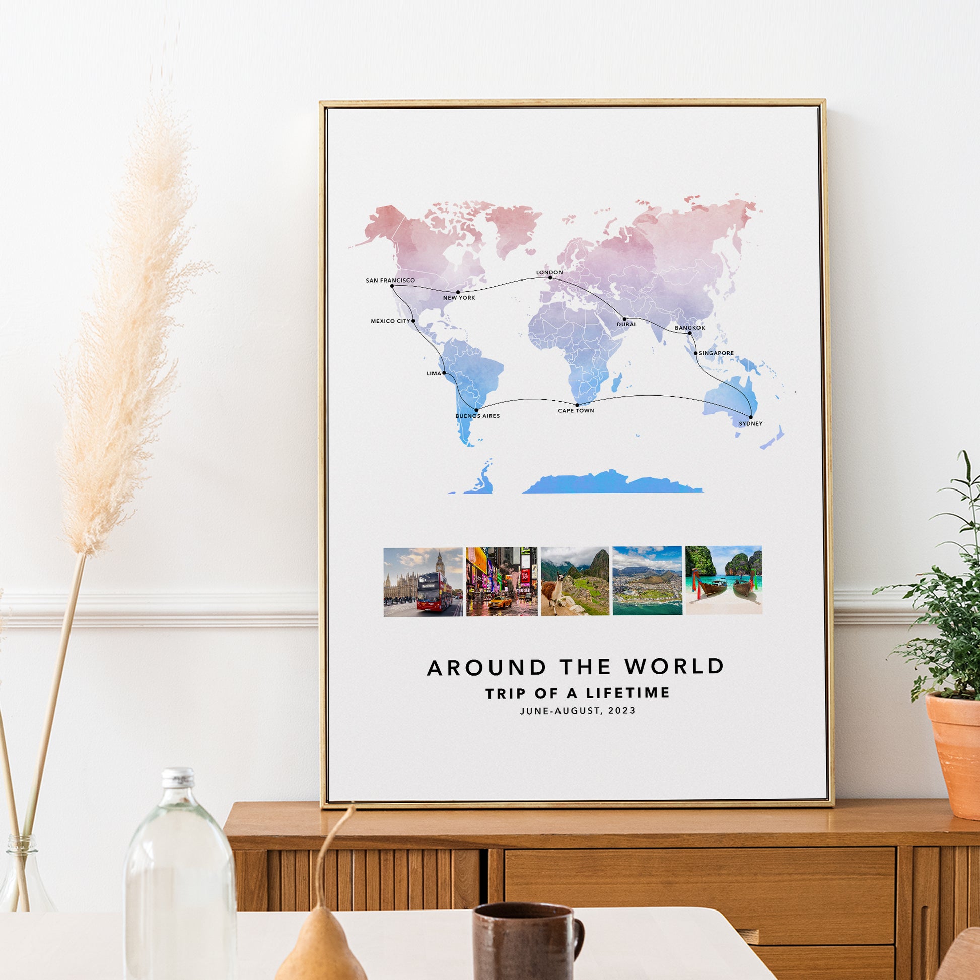 Personalised travel map print with custom locations, travel path and photos in many colours and shades. Make it extra personal by displaying optional travel dates, a photo collage and all the amazing places you visited. Your visited locations will be connected by a path in the order you list them or pinpointed without a path (please indicate). The map can show an entire country or could be zoomed in to showcase your locations in the most detail.
